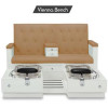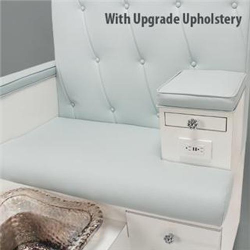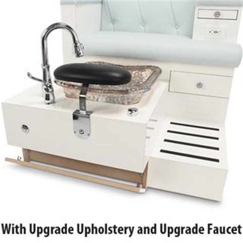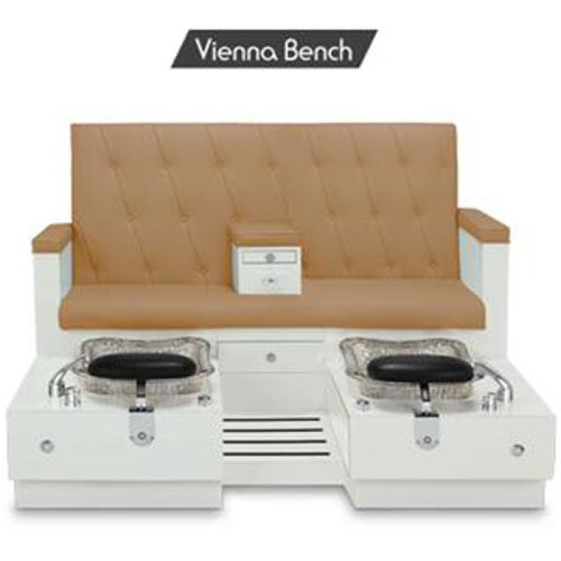 Featuring The Vienna Bench with multilevel massage function within its luxurious upholstery. Easy to clean high gloss white laminate showcases the cool elegance. With convenient storage drawer and pull out drink/accessory table along with the aptly positioned USB port. The beautiful glass bowls serenely sparkles through the water extending the tranquility of your customers undeniable pedicure experience.