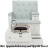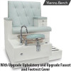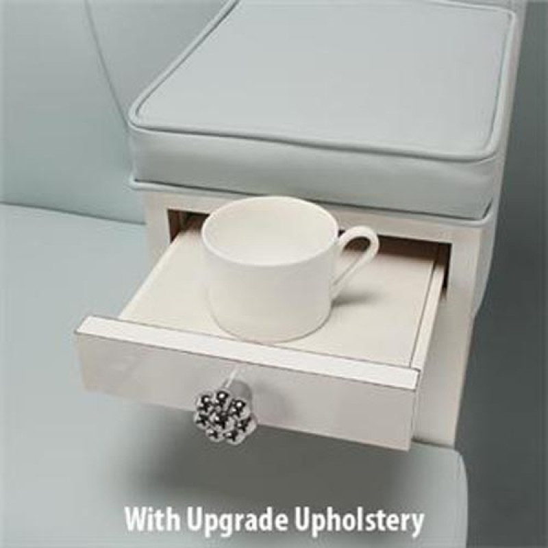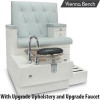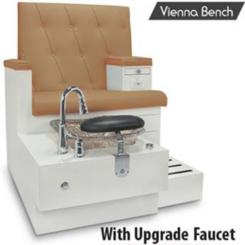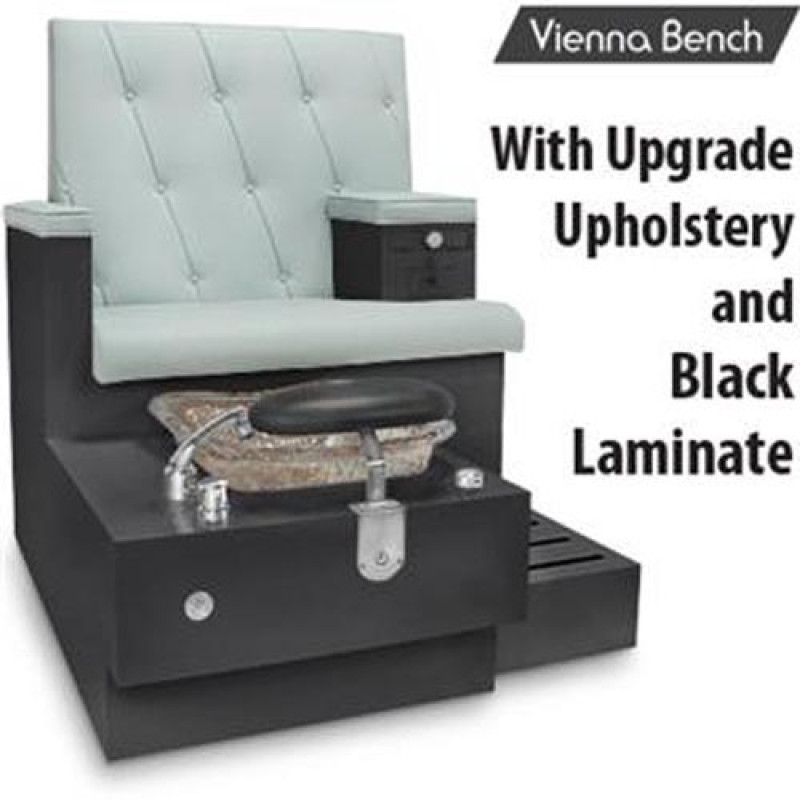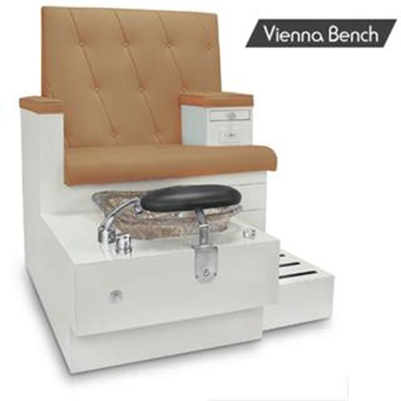 Featuring The Vienna Bench with multilevel massage function within its luxurious upholstery. Easy to clean high gloss white laminate showcases the cool elegance. With convenient storage drawer and pull out drink/accessory table along with the aptly positioned USB port. The beautiful glass bowls serenely sparkles through the water extending the tranquility of your customers undeniable pedicure experience.