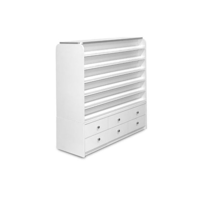The "Sonoma" double sided cabinet is a great way to display all of your polish and powders! Six tiered shelves, with clear acrylic lip, allows your customer to view the powder and polish combinations together. The cabinet has the convenience of 6 individual drawers, on 1 side, for storing your extra products. Each of the 3 top drawers are divided in 5 rows for your extra powders and the 3 bottom drawers are divided in 8 rows for your extra polish.