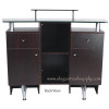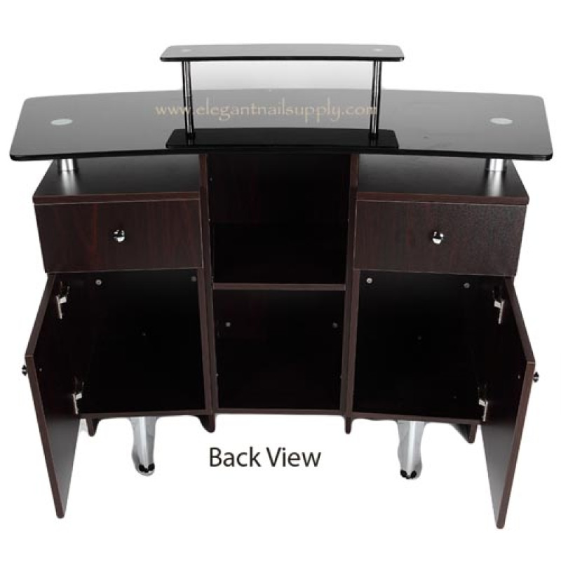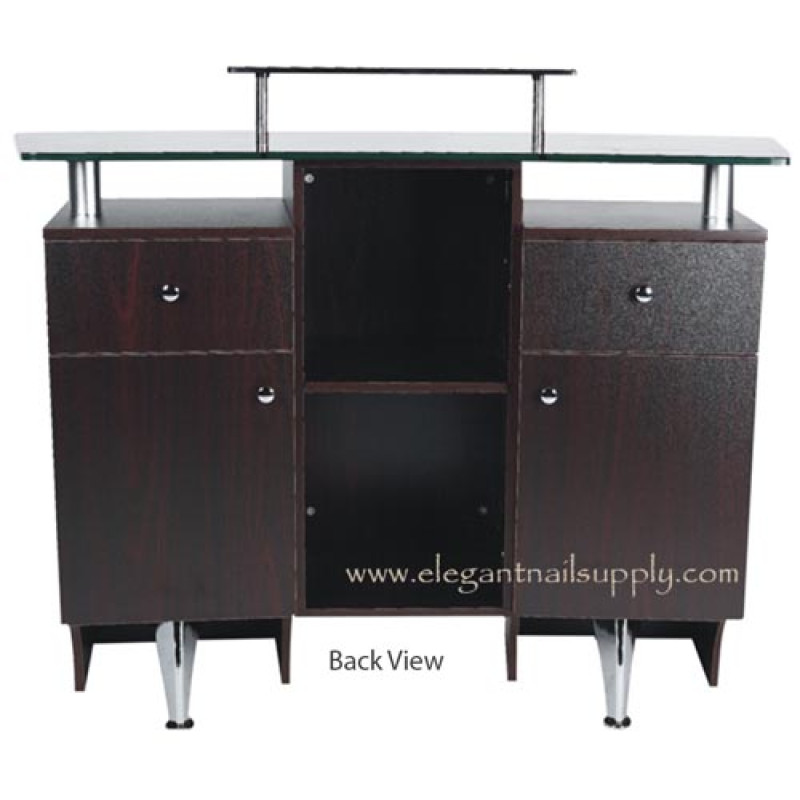 Quick Overview : Features decorative front metal panel in nickel finish, and beautiful glass counter top and second level mini glass shelf. Comes with (2) convenient drawers, (2) cabinets and middle open shelf storage.