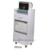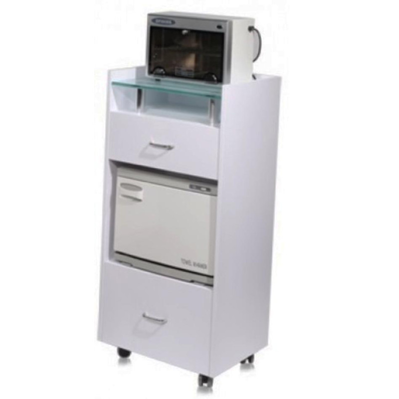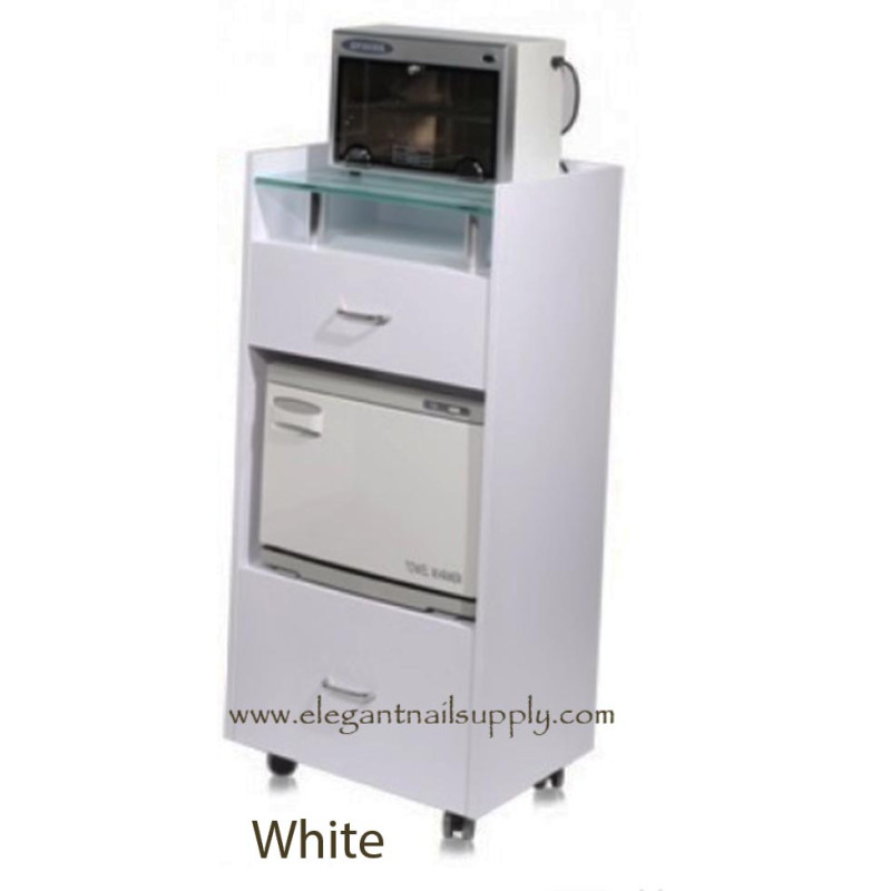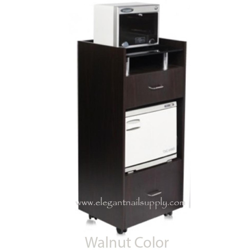 Clean and contemporary design workstation trolley features glass top shelf, two convenient storage drawers, hot towel cabinet space and (4) casters. The workstation trolley provides versatility in both function and design. Available in walnut brown wood with smoked glass top or white wood with frosted glass top. Matching glass top nail tables also available for coordinating your salon décor.